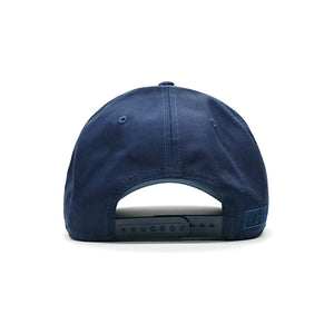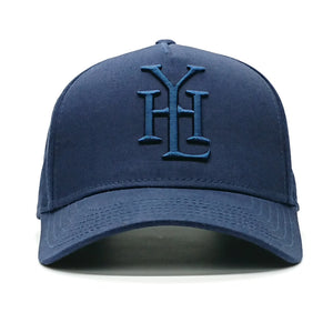 This baseball cap features YHL Monogram embroidered on the front of the cap in navy blue emboss stitch. There is a canvas back with a YHL logo patch on the side.