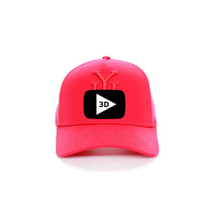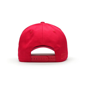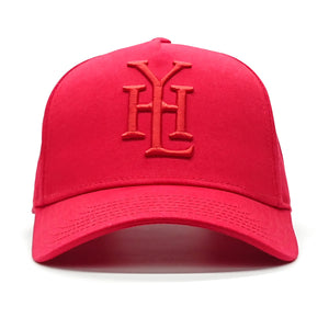 This baseball cap features YHL Monogram embroidered on the front of the cap in red emboss stitch. There is a canvas back with a YHL logo patch on the side.