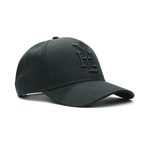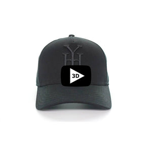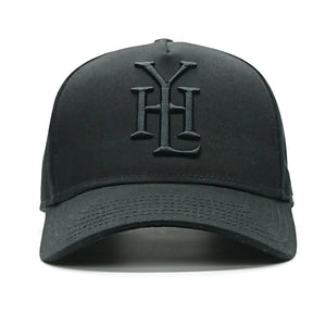 This baseball cap features YHL Monogram embroidered on the front of the cap in black emboss stitch. There is a canvas back with a YHL logo patch on the side.