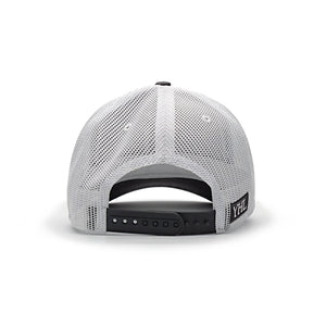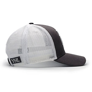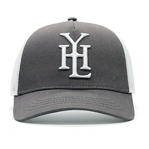 This baseball cap features YHL Monogram embroidered on the front of the cap in white emboss stitch. There is a grey front and a white mesh back with a YHL logo patch on the side.