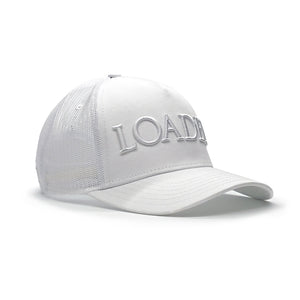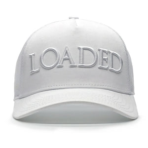 This baseball cap features LOADED embroidered on the front of the cap in white emboss stitch. There is a mesh back with a YHL logo patch on the side.