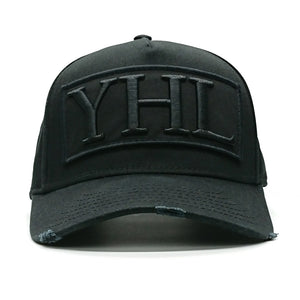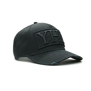 This baseball cap features YHL Logo embroidered on the front of the cap in black emboss stitch. There is a canvas back with a YHL logo patch on the side.