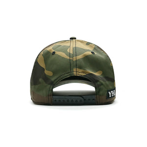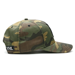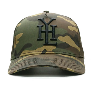 This baseball cap features YHL Monogram embroidered on the front of the cap in black emboss stitch. There is a canvas back with a YHL logo patch on the side.
