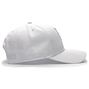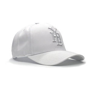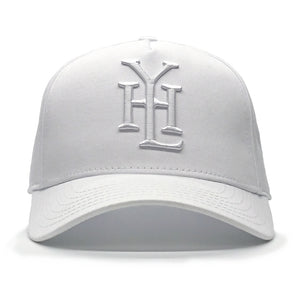 This baseball cap features YHL Monogram embroidered on the front of the cap in white emboss stitch. There is a canvas back with a YHL logo patch on the side.