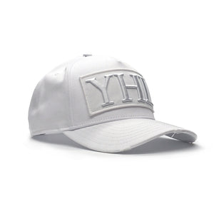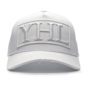 This baseball cap features YHL Logo embroidered on the front of the cap in white emboss stitch. There is a canvas back with a YHL logo patch on the side.