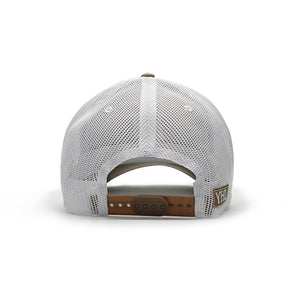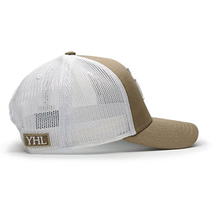 This baseball cap features YHL Monogram embroidered on the front of the cap in white emboss stitch. There is a khaki front and a white mesh back with a YHL logo patch on the side.